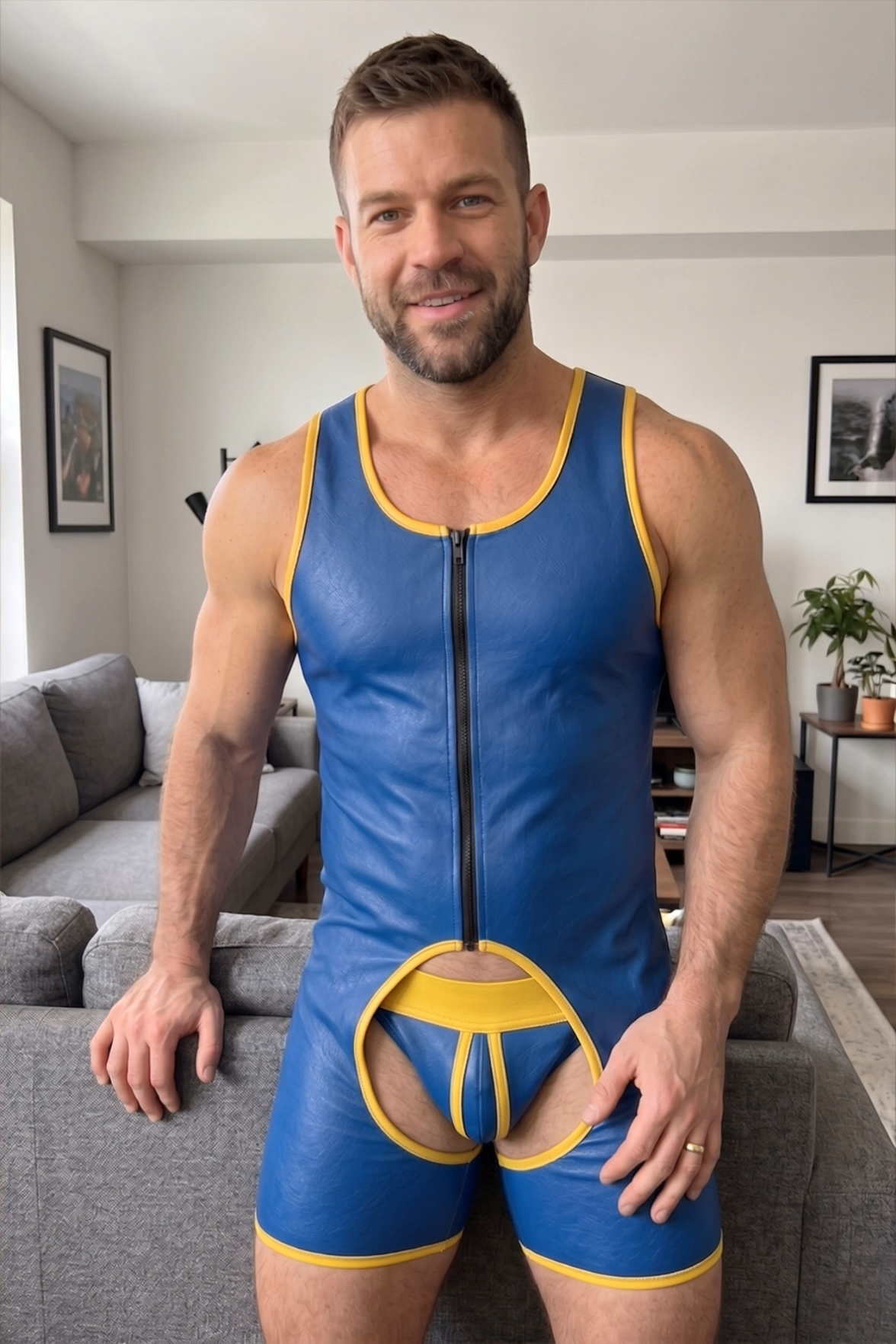 Mysteryglove Blue Matte PU Leather Bodysuit with Yellow Accents and Rear Cutout.
