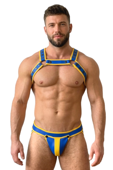 Mysteryglove Blue Yellow Contrast Strap Harness and Brief Set