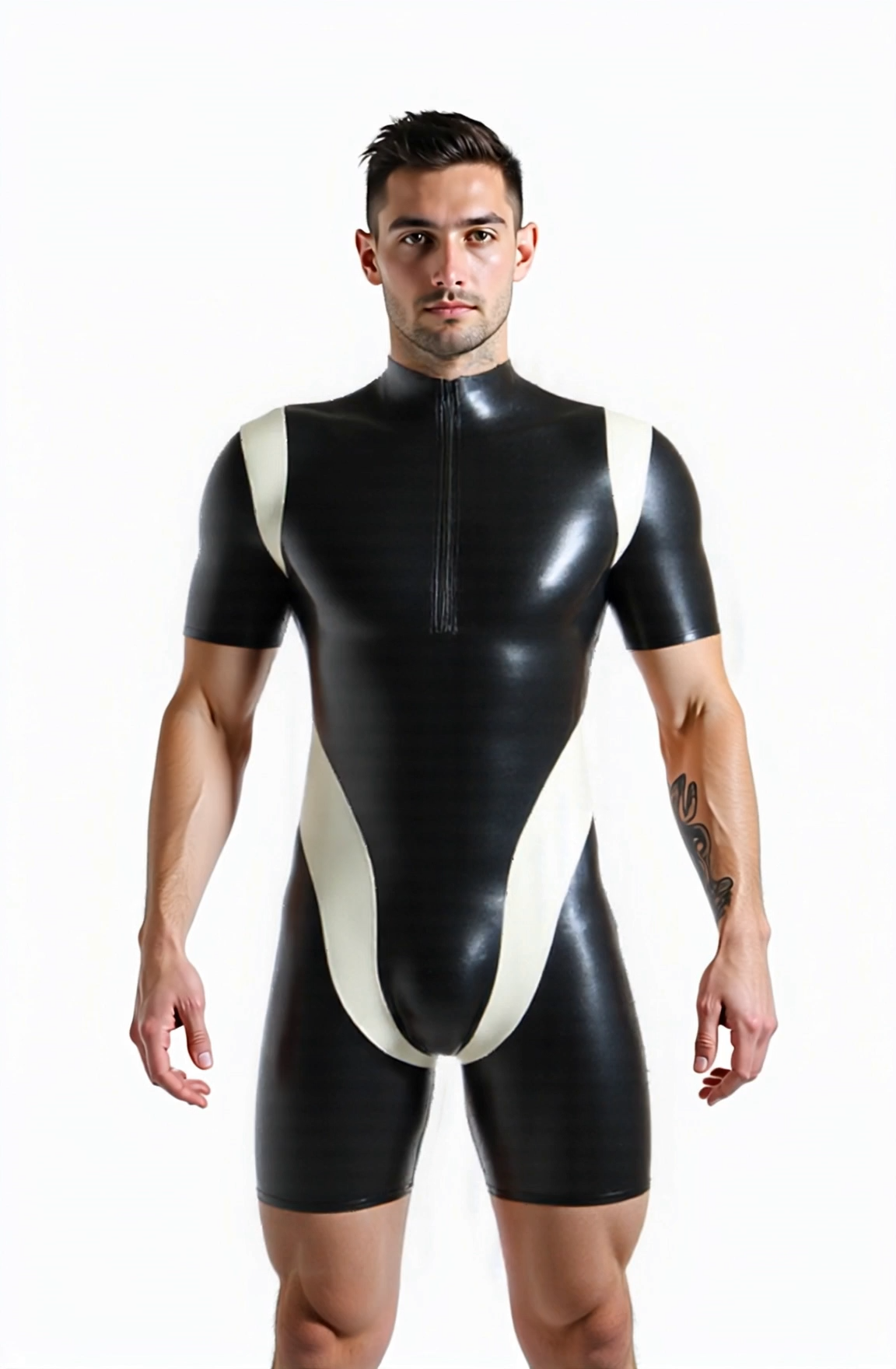 Mysteryglove Black & White Glossy Bodysuit – Short Sleeve One-Piece with Front Zip Mysteryglove Black & White Glossy Bodysuit – Short Sleeve One-Piece with Front Zip