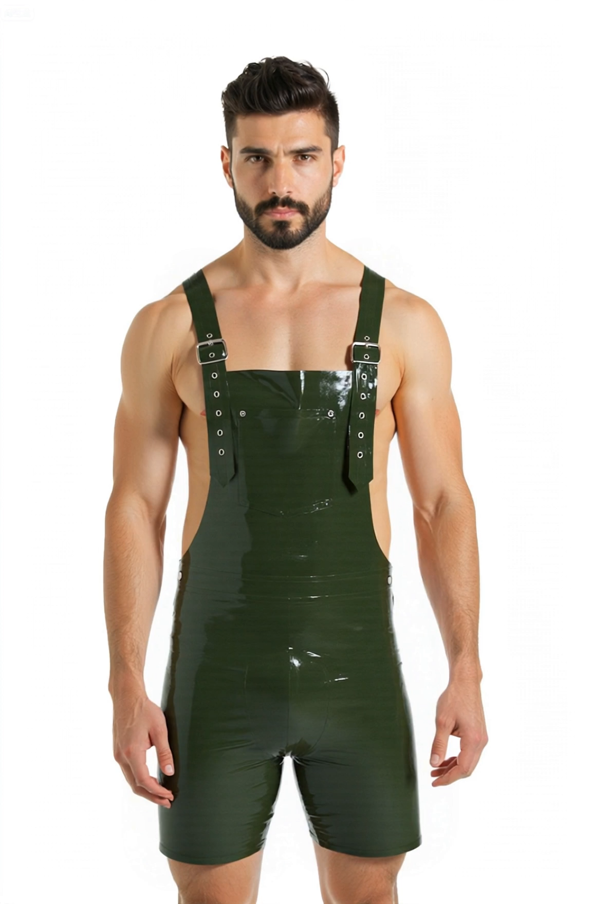 Mysteryglove Men’s PU Leather Overalls – Glossy Green Fetish Short Bib Jumpsuit