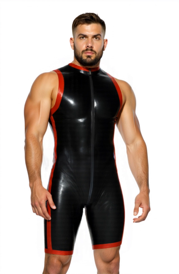 Glossy black sleeveless bodysuit with dual zippers and sport-inspired lines.