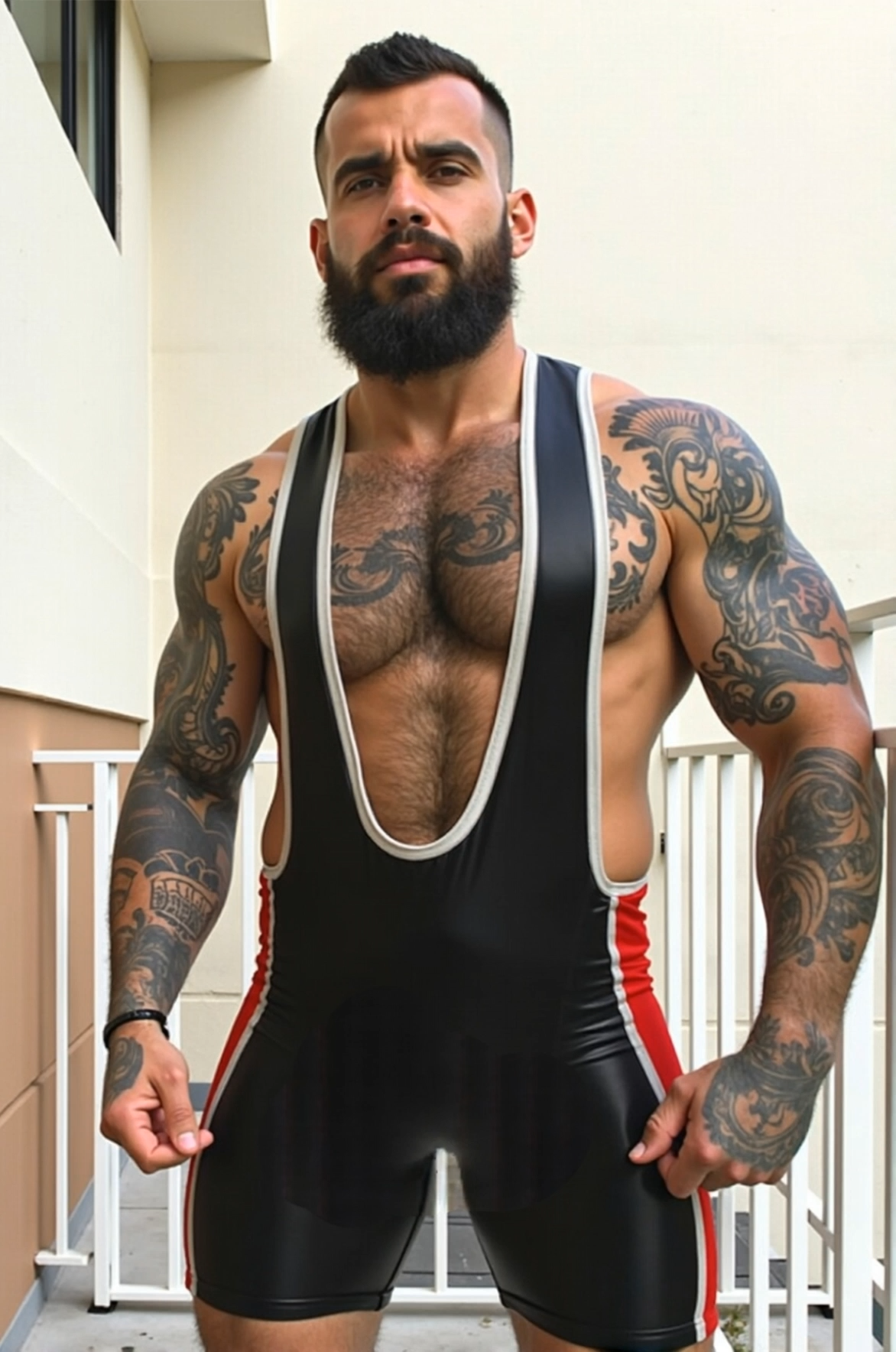 Sculpted wrestler cut with metallic look, contour seams, and bold edges