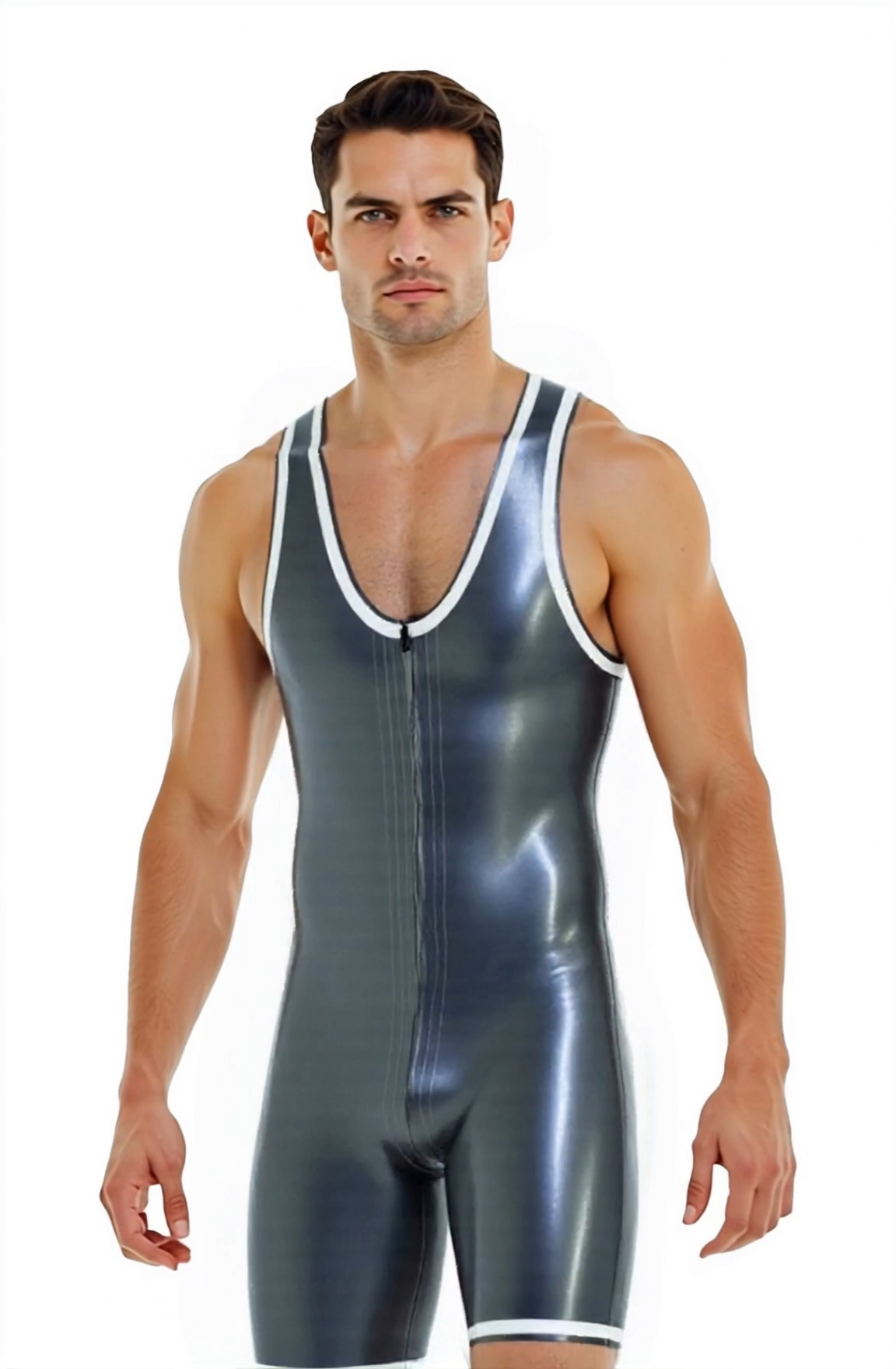 Glossy PU singlet with bold colorways and sculpted masculine silhouette.