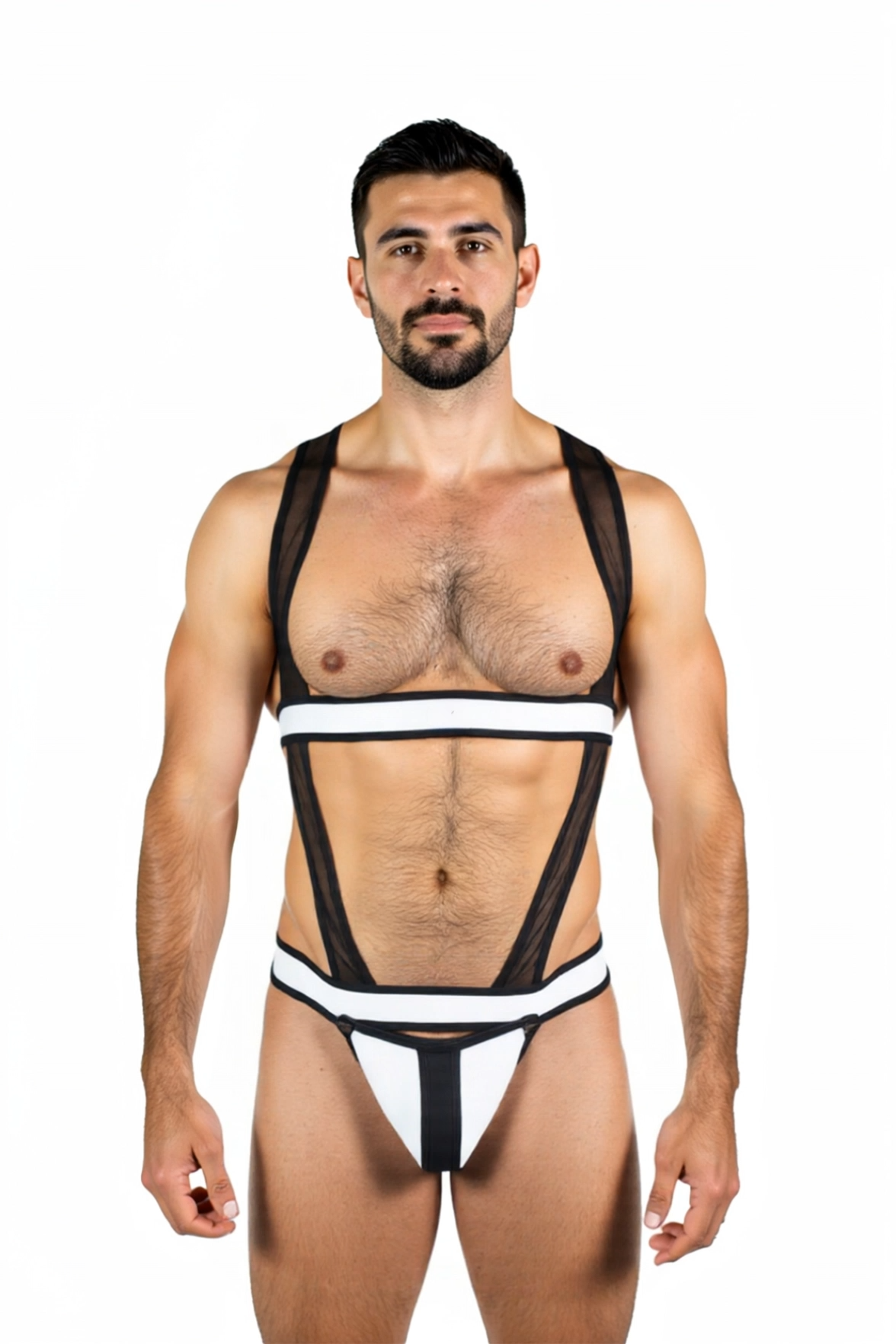 A daring and seductive mesh and elastic harness brief set for bold men.