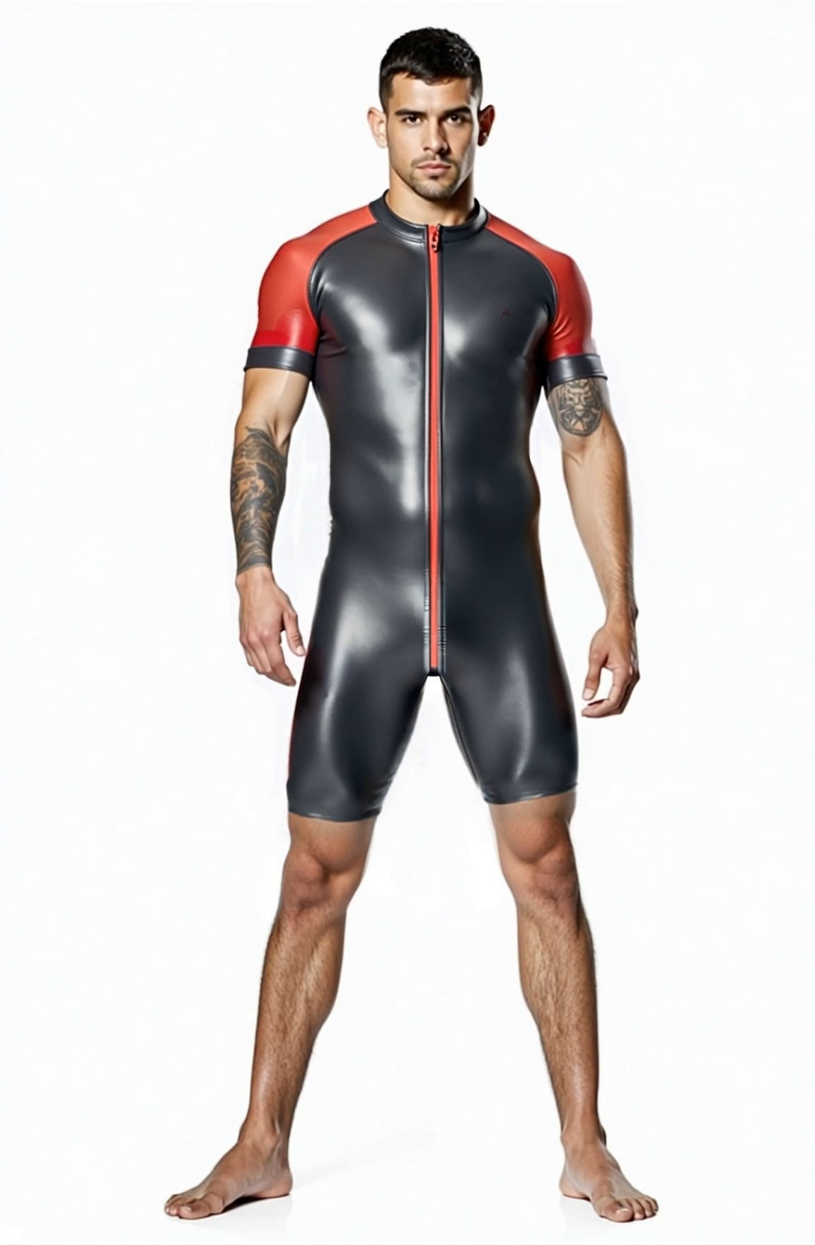 Mysteryglove Shiny Black & Red PU Leather Skin-Tight Romper – Full-Body Zip Jumpsuit