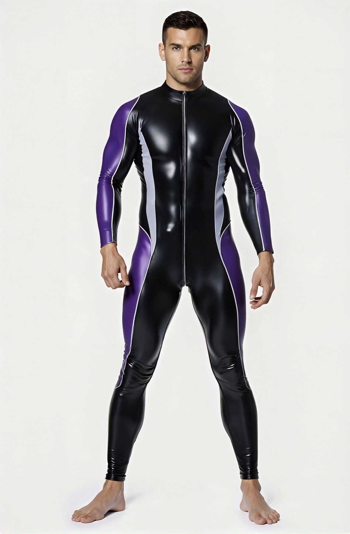A striking black and purple jumpsuit designed for men’s bold style.